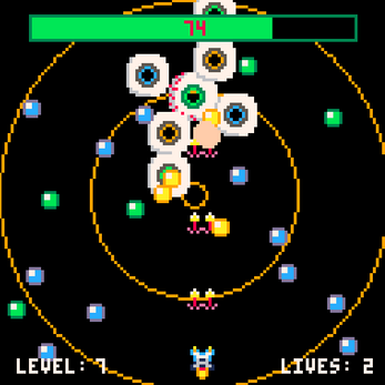Eyeboss is designed to be a short, yet well-polished, tough-as-nails bullet hell boss shooter designed with Pico-8. It features 2 play modes, Survive and Destroy, each of which can be played on Normal or Hard difficulty, and 10 levels to clear. The music and background will become progressively more intense as you proceed through the levels.